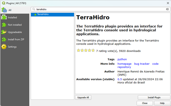 The TerraHidro plugin for the QGIS Processing Toolbox provides users with interfaces that allow all TerraHidro functionalities to be executed directly inside QGIS. However, please note that simply installing the plugin does not guarantee its functionality. It is also necessary to configure an environment variable named TERRAHIDRO that points to the directory where the TerraHidro executable was extracted.