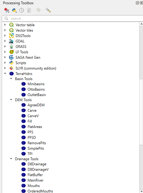 After installation, the TerraHidro plugin will appear in the Processing Toolbox.